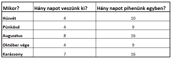 Az augusztus 20-ai ünnep csütörtökre esik, ami automatikusan egy négynapos hosszú hétvégét eredményez. Igaz, ezért augusztus elején lesz egy ledolgozós szombat, de ez bőven megtérül. Ha augusztus közepén néhány nap szabadságot is beiktatsz, akár több mint két hétre is elszakadhatsz a munkától. Ez az időszak ideális hosszabb utazásra, nyaralásra vagy egyszerűen arra, hogy valóban kipihend az év első felét.